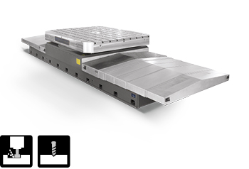 In addition to rotary tables for positioning work pieces for milling work (also in interpolation operation), patented tilting tables with additional axes, for example, are among the repertoire. Due to the standard angular adjustment of up to 10°, these are suitable for milling large an heavy components and, for example, are used in wind energy technology. Pallet changing systems are used to automate machining centres due to the multiple pallets and the ability to set up during main working hours. Thanks to a powerful drive train design, our carousel rotary table achieves very high machining torques, which makes a very good machining performance possible. In addition to the milling, it is also possible to turn and grind work pieces.