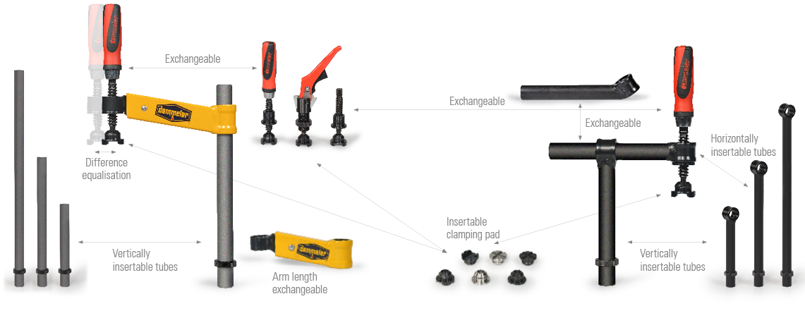 Thanks to the modular system, the clamps adapt perfectly to the respective clamping situation. Select from various materials for the clamping pad and different spindle lengths, also for small installation spaces. The latch lever makes quick and precise clamping possible even with one hand. With three different tube lengths and exchangeable arms, you can handle any clamping task.