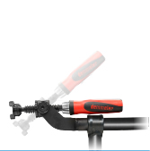 Enables the even build-up of clamping force with large power reserves. The self-centring support and pressure piece clamps the work piece and can be exchanged. - The powder-coated clamping lever features a highly ergonomic shape and swivels 360° degrees to circumvent all interfering edges. The plastic-coated, non-slip release lever ensures a secure grip while loosening the clamp.