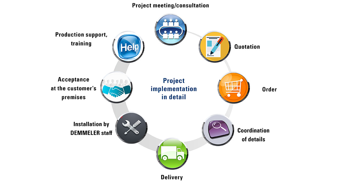The DEMMELER experts support you from planning your production facilities, right through to manufacturing. We incorporate our expertise from numerous successful projects. You receive support from our expert team, helping you make the right decisions starting in the planning phase. Experienced fitters and technicians will examine the floor characteristics and evenness on request, and offer tips on preparatory measures. Our assembly teams take care of professional installation and the alignment of the base rail system. Training for your production team guarantees proper use of the equipment.